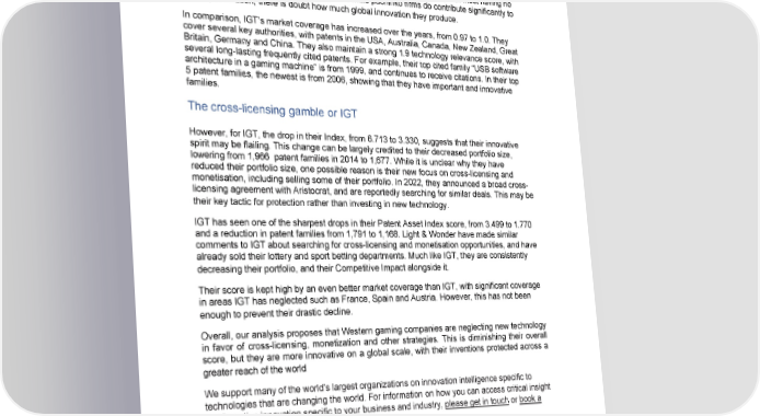 !"#$"%&"'()*)+( September 2023 The Endgame of Innovation +RZ,*7DQG/LJKW :RQGHUILJKWIRUWKHKLJKVFRUH +RZHYHURQHQRWDEOHQHJDWLYHSRLQWWRSDFKLQNRLVHYLGHQWIURPRXUJUDSK7KHPDMRULW\RI SDFKLQNRFRPSDQLHV¶3DWHQW$VVHW,QGH[HVDUHGHFOLQLQJGHVSLWHWKHLULQFUHDVHLQSRUWIROLR VL]H7KLVLVGXHWRWKHLUFRQWLQXDOO\GLPLQLVKLQJ0DUNHW&RYHUDJHVFRUHVZLWKPRVWKDYLQJQR SUHVHQFHRXWVLGHRI$VLD7KLVVXJJHVWVWKDWZKLOHSDFKLQNRILUPVGRFRQWULEXWHVLJQLILFDQWO\WR JDPLQJLQQRYDWLRQWKHUHLVGRXEWKRZPXFKJOREDOLQQRYDWLRQWKH\SURGXFH ,QFRPSDULVRQ,*7¶VPDUNHWFRYHUDJHKDVLQFUHDVHGRYHUWKH\HDUVIURPWR7KH\ FRYHUVHYHUDONH\DXWKRULWLHVZLWKSDWHQWVLQWKH86$$XVWUDOLD&DQDGD1HZ=HDODQG*UHDW %ULWDLQ*HUPDQ\DQG&KLQD7KH\DOVRPDLQWDLQDVWURQJWHFKQRORJ\UHOHYDQFHVFRUHZLWK VHYHUDOORQJODVWLQJIUHTXHQWO\FLWHGSDWHQWV)RUH[DPSOHWKHLUWRSFLWHGIDPLO\³86%VRIWZDUH DUFKLWHFWXUHLQDJDPLQJPDFKLQH´LVIURPDQGFRQWLQXHVWRUHFHLYHFLWDWLRQV,QWKHLUWRS SDWHQWIDPLOLHVWKHQHZHVWLVIURPVKRZLQJWKDWWKH\KDYHLPSRUWDQWDQGLQQRYDWLYH IDPLOLHV ?4"$C-1&&D/+C"7&+7($('0E/"$1-$*>?$ +RZHYHUIRU,*7WKHGURSLQWKHLU,QGH[IURPWRVXJJHVWVWKDWWKHLULQQRYDWLYH VSLULWPD\EHIODLOLQJ7KLVFKDQJHFDQEHODUJHO\FUHGLWHGWRWKHLUGHFUHDVHGSRUWIROLRVL]H ORZHULQJIURPSDWHQWIDPLOLHVLQWR:KLOHLWLVXQFOHDUZK\WKH\KDYH UHGXFHGWKHLUSRUWIROLRVL]HRQHSRVVLEOHUHDVRQLVWKHLUQHZIRFXVRQFURVVOLFHQVLQJDQG PRQHWLVDWLRQLQFOXGLQJVHOOLQJVRPHRIWKHLUSRUWIROLR,QWKH\DQQRXQFHGDEURDGFURVV OLFHQVLQJDJUHHPHQWZLWK$ULVWRFUDWDQGDUHUHSRUWHGO\VHDUFKLQJIRUVLPLODUGHDOV7KLVPD\EH WKHLUNH\WDFWLFIRUSURWHFWLRQUDWKHUWKDQLQYHVWLQJLQQHZWHFKQRORJ\ ,*7KDVVHHQRQHRIWKHVKDUSHVWGURSVLQWKHLU3DWHQW$VVHW,QGH[VFRUHIURPWR DQGDUHGXFWLRQLQSDWHQWIDPLOLHVIURPWR/LJKW :RQGHUKDYHPDGHVLPLODU FRPPHQWVWR,*7DERXWVHDUFKLQJIRUFURVVOLFHQVLQJDQGPRQHWLVDWLRQRSSRUWXQLWLHVDQGKDYH DOUHDG\VROGWKHLUORWWHU\DQGVSRUWEHWWLQJGHSDUWPHQWV0XFKOLNH,*7WKH\DUHFRQVLVWHQWO\ GHFUHDVLQJWKHLUSRUWIROLRDQGWKHLU&RPSHWLWLYH,PSDFWDORQJVLGHLW 7KHLUVFRUHLVNHSWKLJKE\DQHYHQEHWWHUPDUNHWFRYHUDJHWKDQ,*7ZLWKVLJQLILFDQWFRYHUDJH LQDUHDV,*7KDVQHJOHFWHGVXFKDV)UDQFH6SDLQDQG$XVWULD+RZHYHUWKLVKDVQRWEHHQ HQRXJKWRSUHYHQWWKHLUGUDVWLFGHFOLQH 2YHUDOORXUDQDO\VLVSURSRVHVWKDW:HVWHUQJDPLQJFRPSDQLHVDUHQHJOHFWLQJQHZWHFKQRORJ\ LQIDYRURIFURVVOLFHQVLQJPRQHWL]DWLRQDQGRWKHUVWUDWHJLHV7KLVLVGLPLQLVKLQJWKHLURYHUDOO VFRUHEXWWKH\DUHPRUHLQQRYDWLYHRQDJOREDOVFDOHZLWKWKHLULQYHQWLRQVSURWHFWHGDFURVVD JUHDWHUUHDFKRIWKHZRUOG :HVXSSRUWPDQ\RIWKHZRUOG¶VODUJHVWRUJDQL]DWLRQVRQLQQRYDWLRQLQWHOOLJHQFHVSHFLILFWR WHFKQRORJLHVWKDWDUHFKDQJLQJWKHZRUOG)RULQIRUPDWLRQRQKRZ\RXFDQDFFHVVFULWLFDOLQVLJKW RQGLVUXSWLYHLQQRYDWLRQVSHFLILFWR\RXUEXVLQHVVDQGLQGXVWU\SOHDVHJHWLQWRXFKRUERRND PHHWLQJ :ULWWHQE\-DPHV+XQWHU 'DWH6HSWHPEHU To learn more visit us at c( ® LexisNexis Intellectual Property Solutions. To learn more visit us at ® LexisNexis Intellectual Property Solu琀椀ons. Bringing clarity to innovation. ZZZ/H[LV1H[LV,3FRP&LSKHU J( !69#"(m(;.%72@(72A1/$'B( LexisNexisIP.com/Cipher Bringing clarity to innova琀椀on.